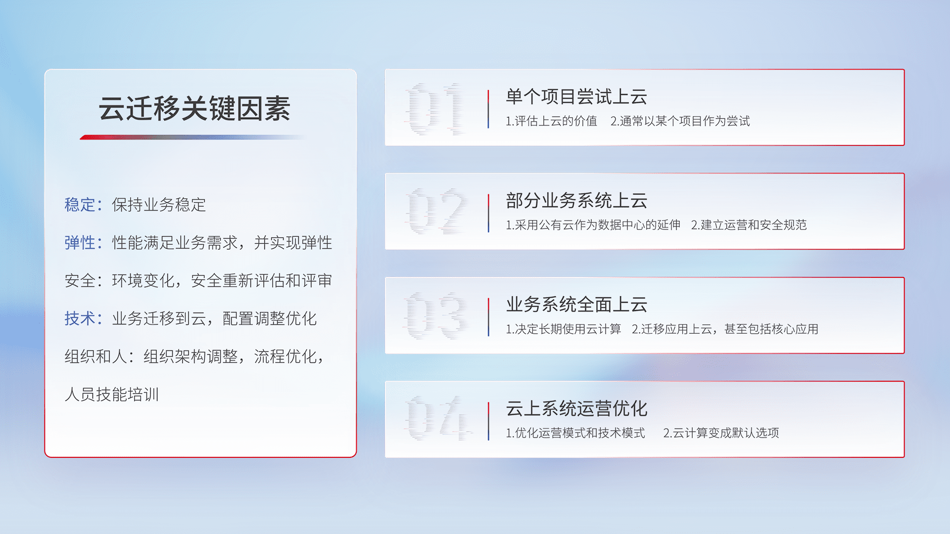 结合实际业务,,,,从规划设计、、、、云平台选型、、、、云原生改造、、、、数据迁移、、、集成交付,,,迁移全过程为客户识别最佳上云路径,,,,做好风险识别管理,,,设计网络架构、、身份权限、、、安全审计合规、、、、操作审计、、日志审计、、、监控告警策略、、、多站点容灾设计等,,对云上基础设施进行整体规划,,,提升IT治理水平,,以满足弹性、、、高可用、、、高性能的需求。。